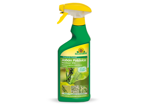 Neudosan RTU é um inseticida natural à base de sabão de potássio, autorizado para uso doméstico e eficaz contra pragas comuns, como pulgões, ácaros vermelhos e moscas-brancas.